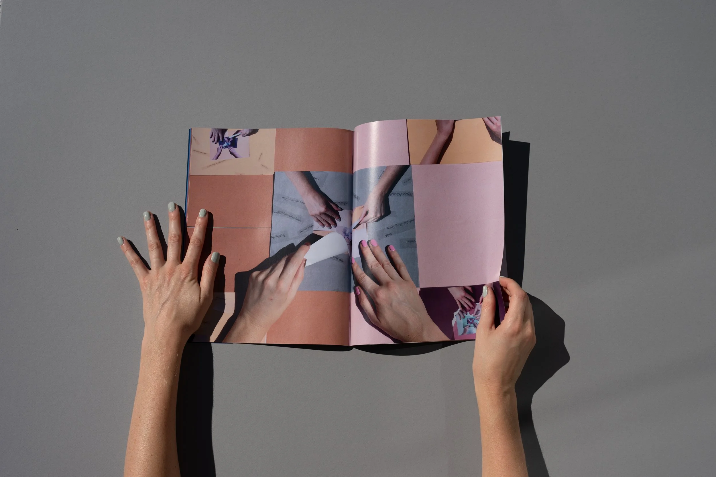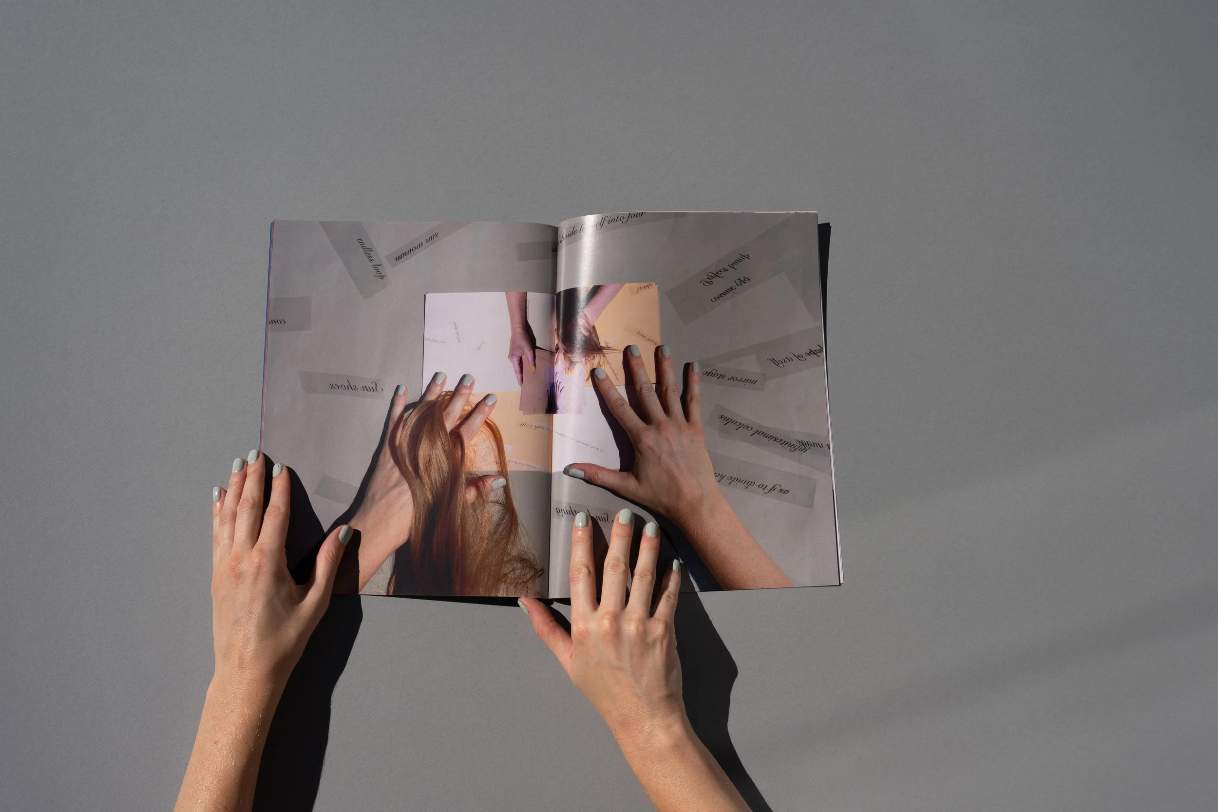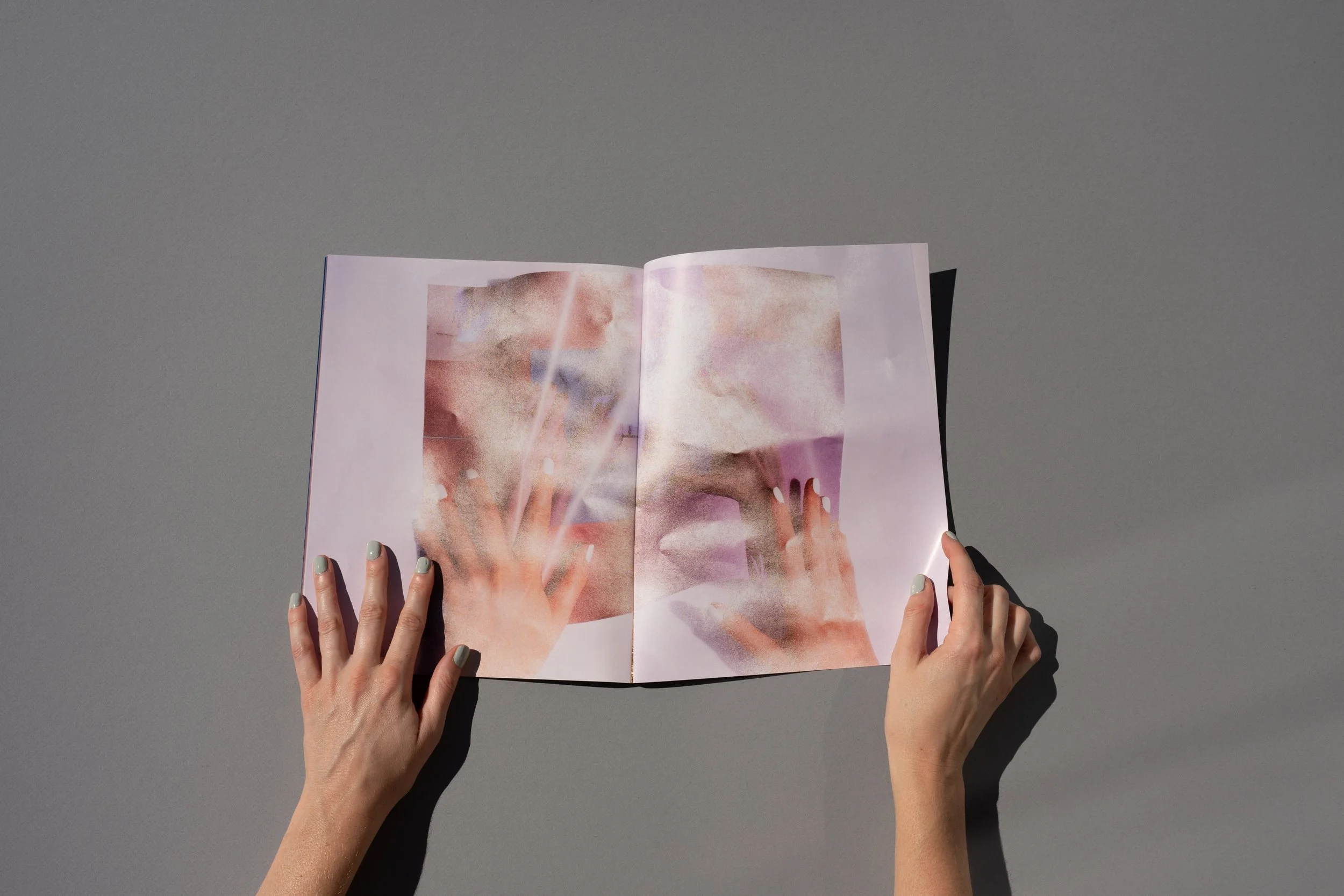 As the text changes through the process of reproduction, so does the visual environment. Sunbathing, Sunloathing originates from documentation of Patent Leather Sun, where a set of female hands (belonging to the artist/author) turns through the book. With each page, the original source material becomes increasingly removed, disappearing into an expanse of fragmented hands, and eventually subsumed by blinding light. Cumulatively, these works suggest a maternal presence and a fragmented self—a self that cannot come together neatly, and which only becomes more fragmented in the endless interiority of pictorial space.