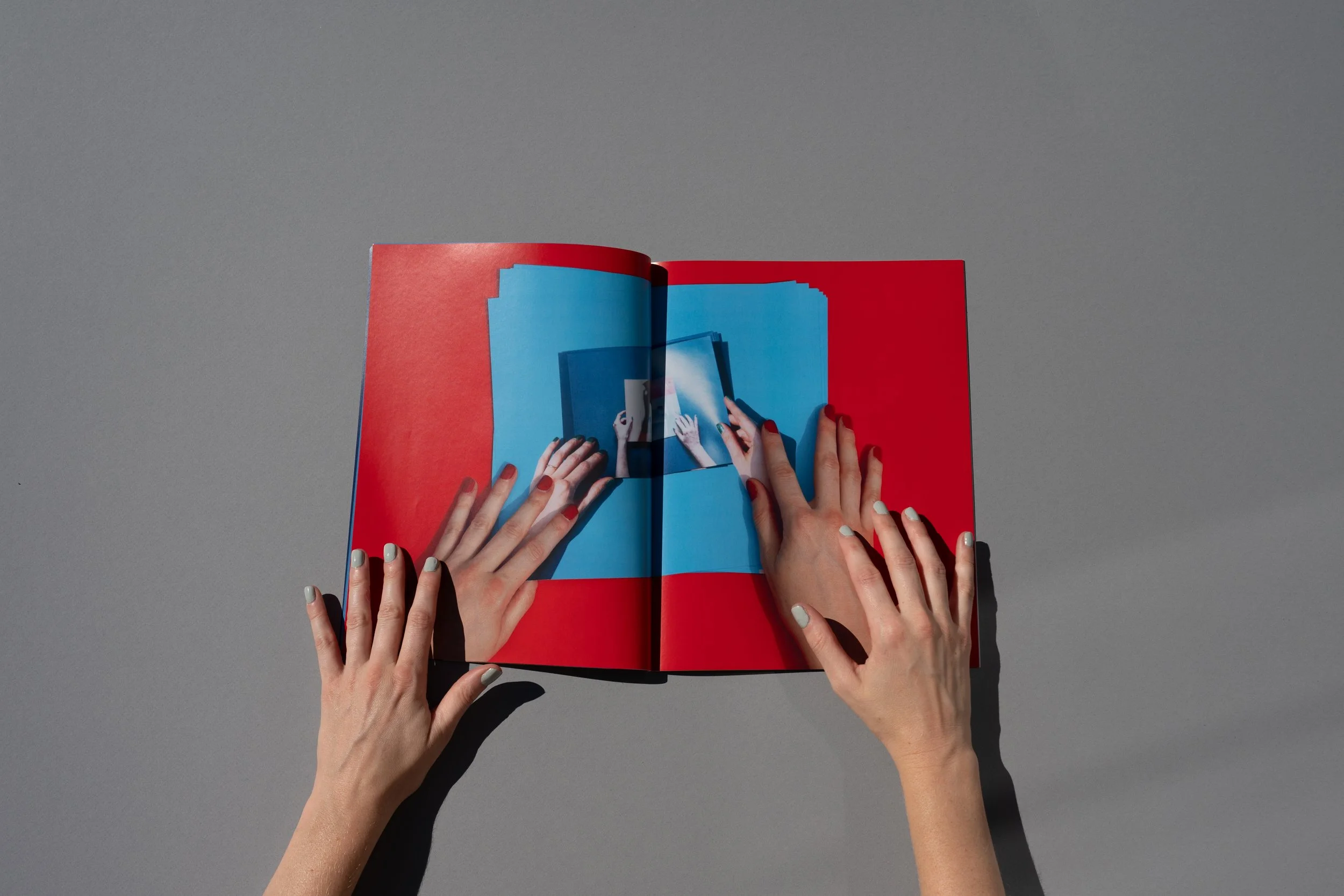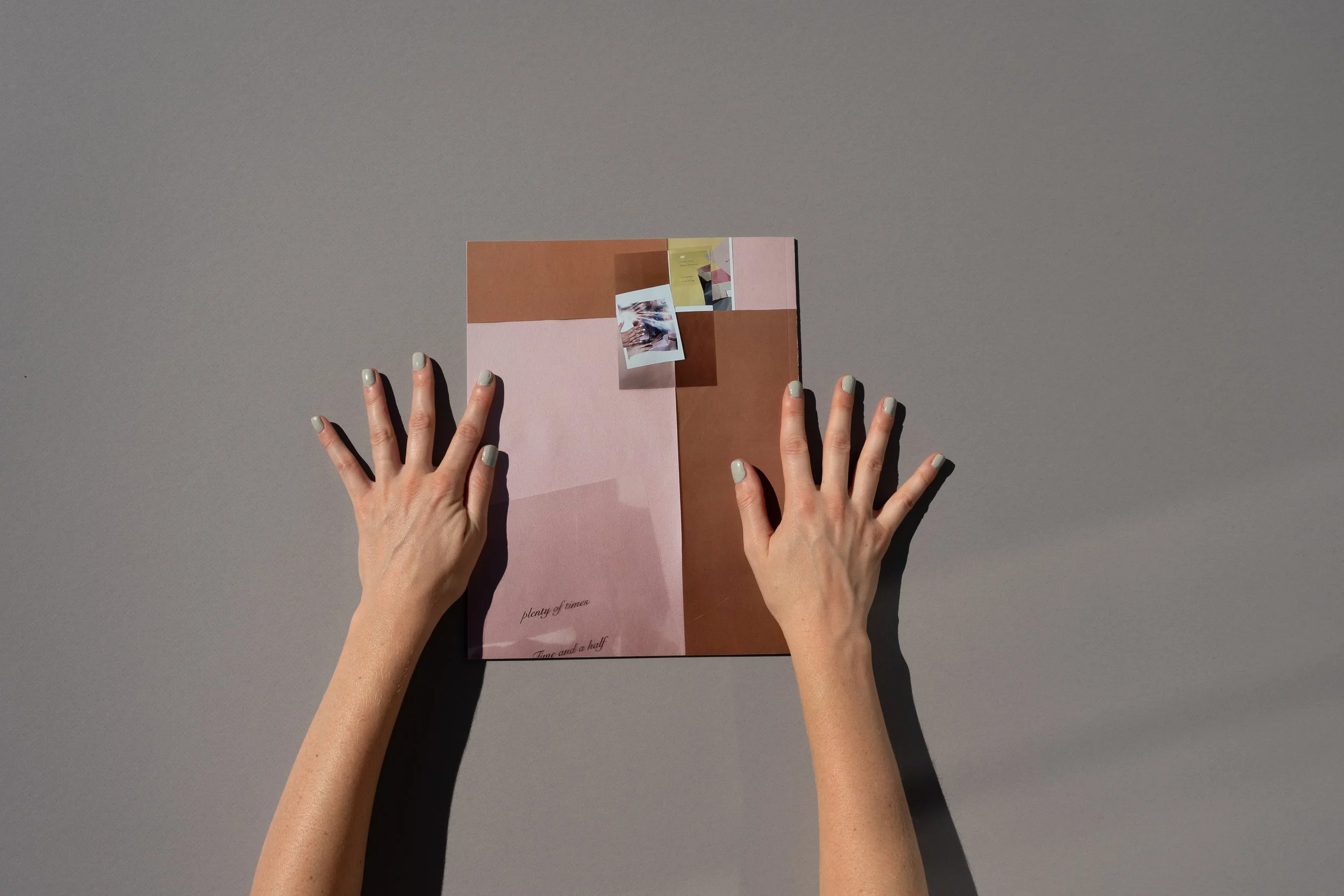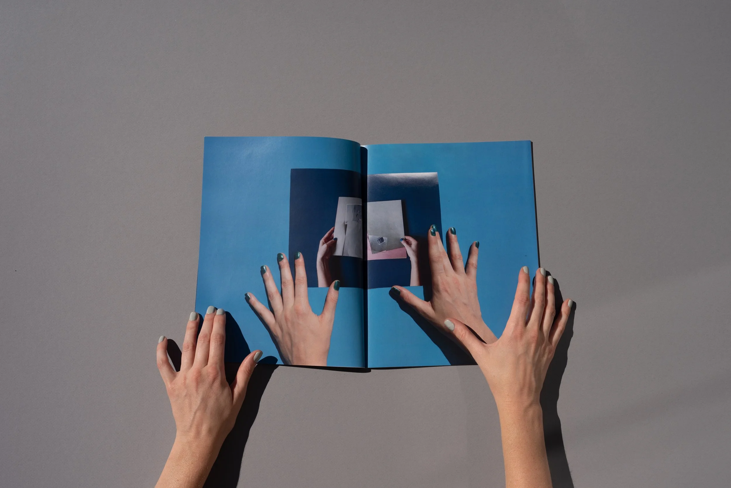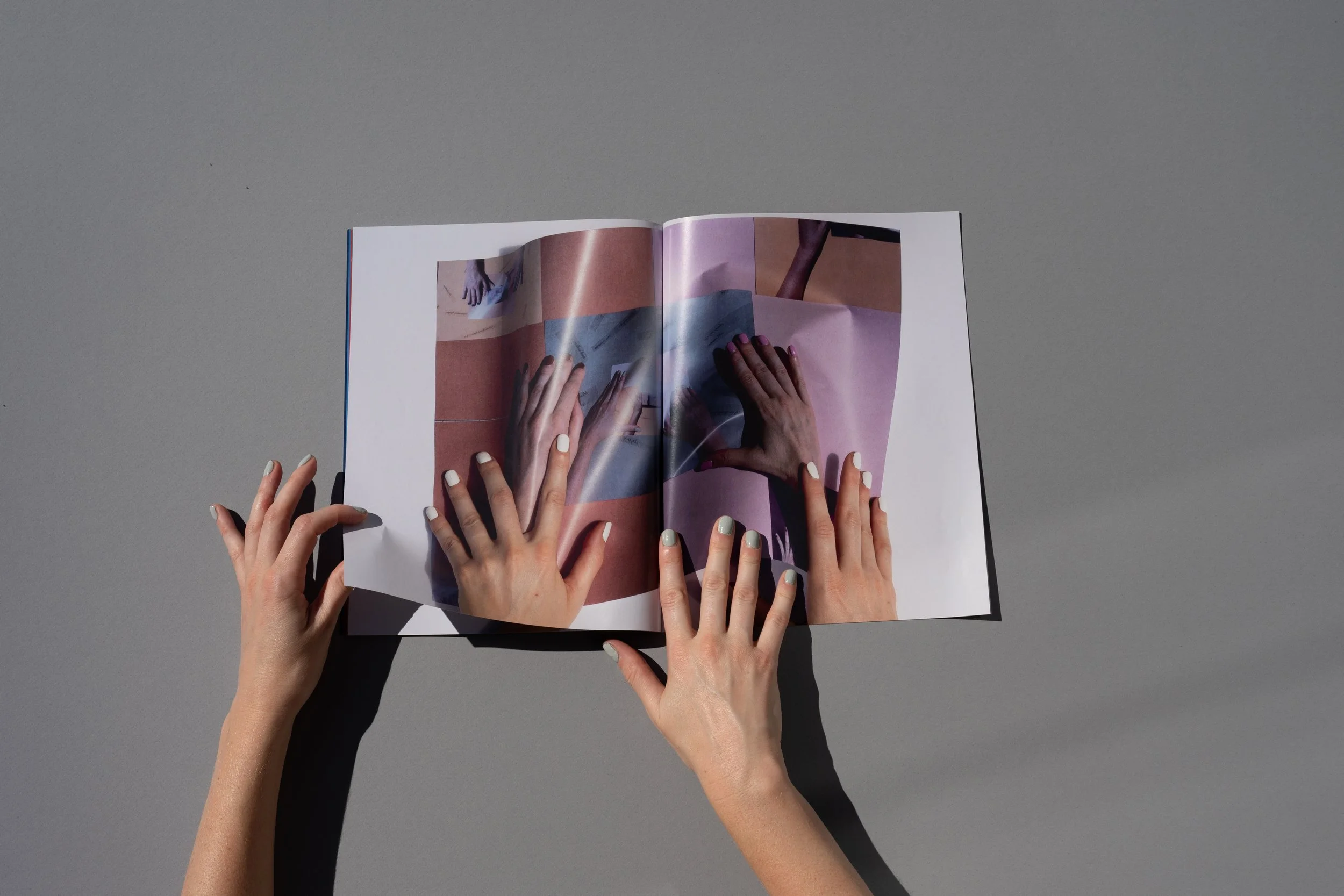 As the text changes through the process of reproduction, so does the visual environment. Sunbathing, Sunloathing originates from documentation of Patent Leather Sun, where a set of female hands (belonging to the artist/author) turns through the book. With each page, the original source material becomes increasingly removed, disappearing into an expanse of fragmented hands, and eventually subsumed by blinding light. Cumulatively, these works suggest a maternal presence and a fragmented self—a self that cannot come together neatly, and which only becomes more fragmented in the endless interiority of pictorial space.
