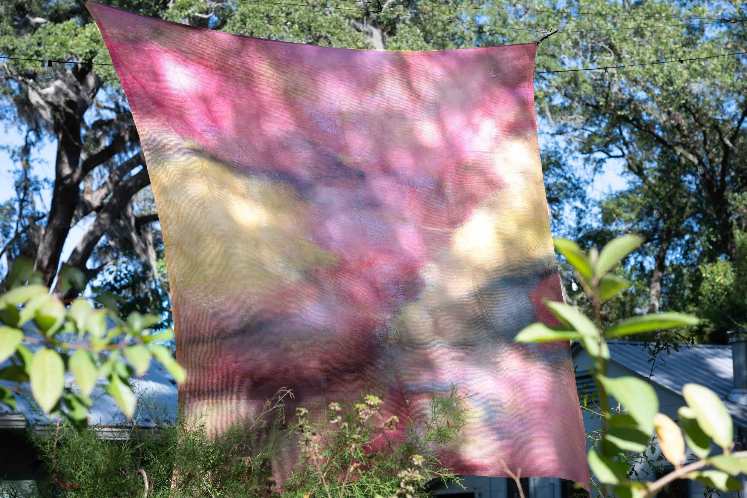 In this installation, a shade sail serves as the substrate for a painting of saturated, cloud-like forms. Standing in contrast to the subtropical scenery of Central Florida, this work imagines the shield of ether between us and the essential yet unyielding force of the sun. What is our threshold for unbearable necessity? How do we position ourselves relative to such forces? And what structures must we build to support our own flourishing?